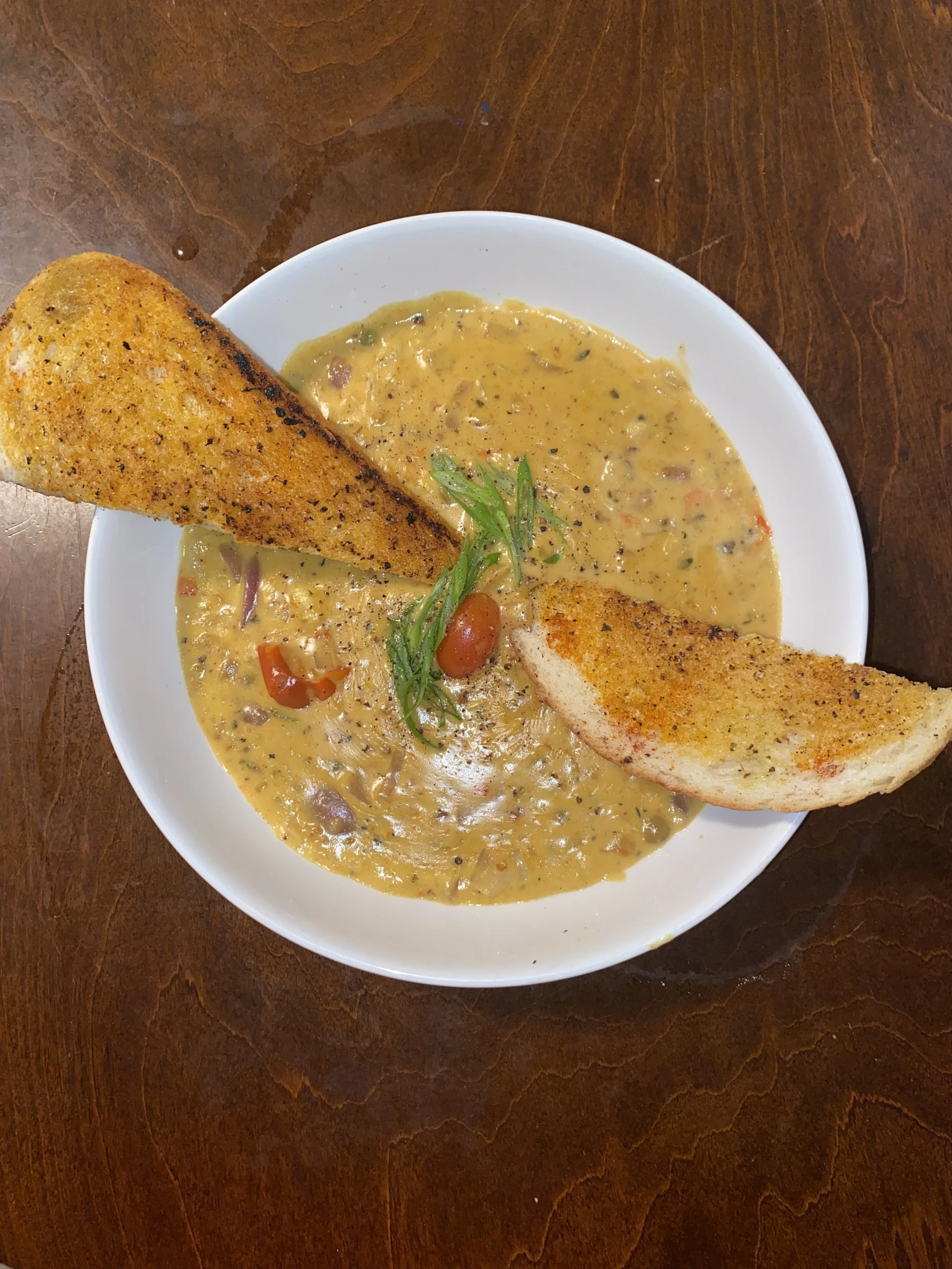 Potatoe & Leek Soup w/English White Cheddar, Heirloom Tomato & Dill